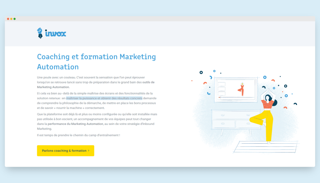 Invox propose une formation en marketing automation qui vous aidera à améliorer vos compétences dans ce domaine. Vous apprendrez à utiliser les outils d’automatisation les plus populaires, à définir des scénarios, à créer des rapports, à configurer des pages de destination et à En plus de l’enseignement théorique, Invox vous offre également la possibilité de mettre en pratique vos connaissances grâce à des séances de coaching.